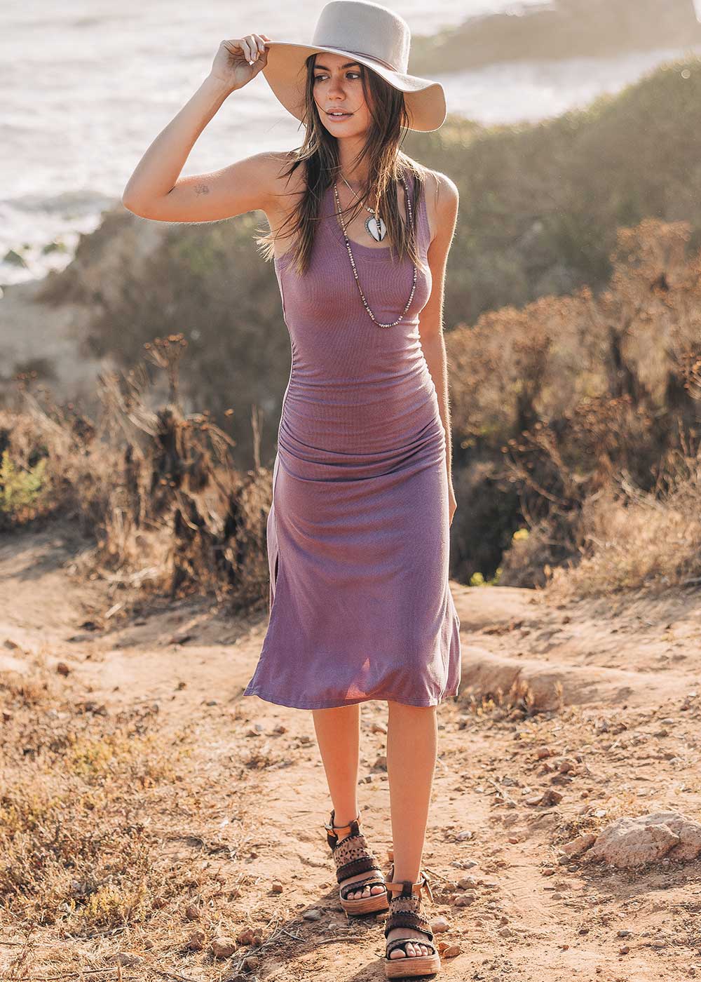 Born from the stars of our Elektra and Nova dresses, Lumina is a radiant blend of comfort and allure. Made from our new hemp macel rib, this midi-length beauty hugs in all the right places, with gentle ruching at the front to flatter and conceal.
