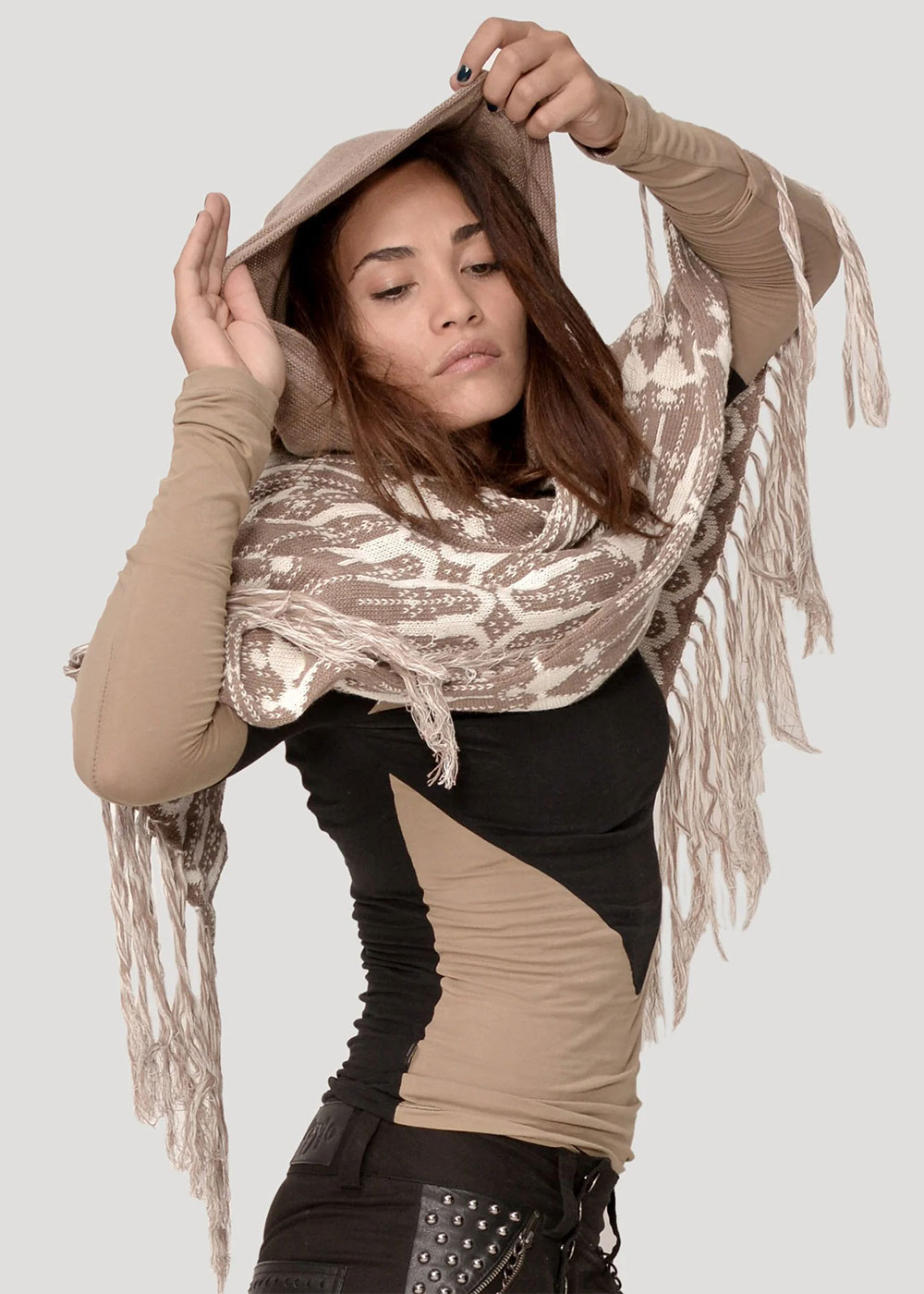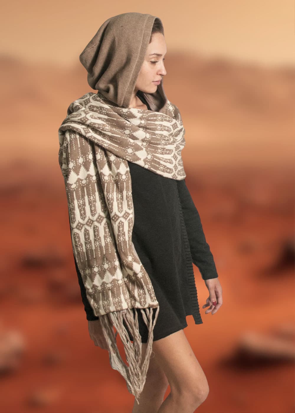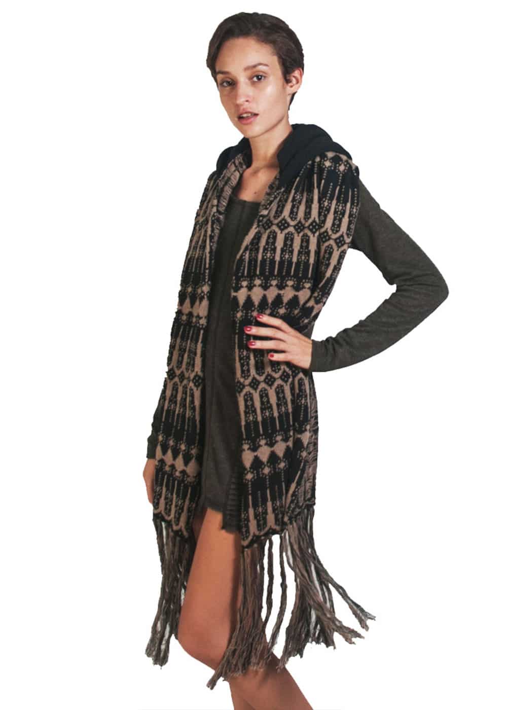The Tribal Hooded Scarf isn’t just a scarf—it’s a whole vibe. Hand-knitted in a bold tribal-inspired pattern, with luxurious tassels, extra length, and a deep hood for maximum cozy drama.