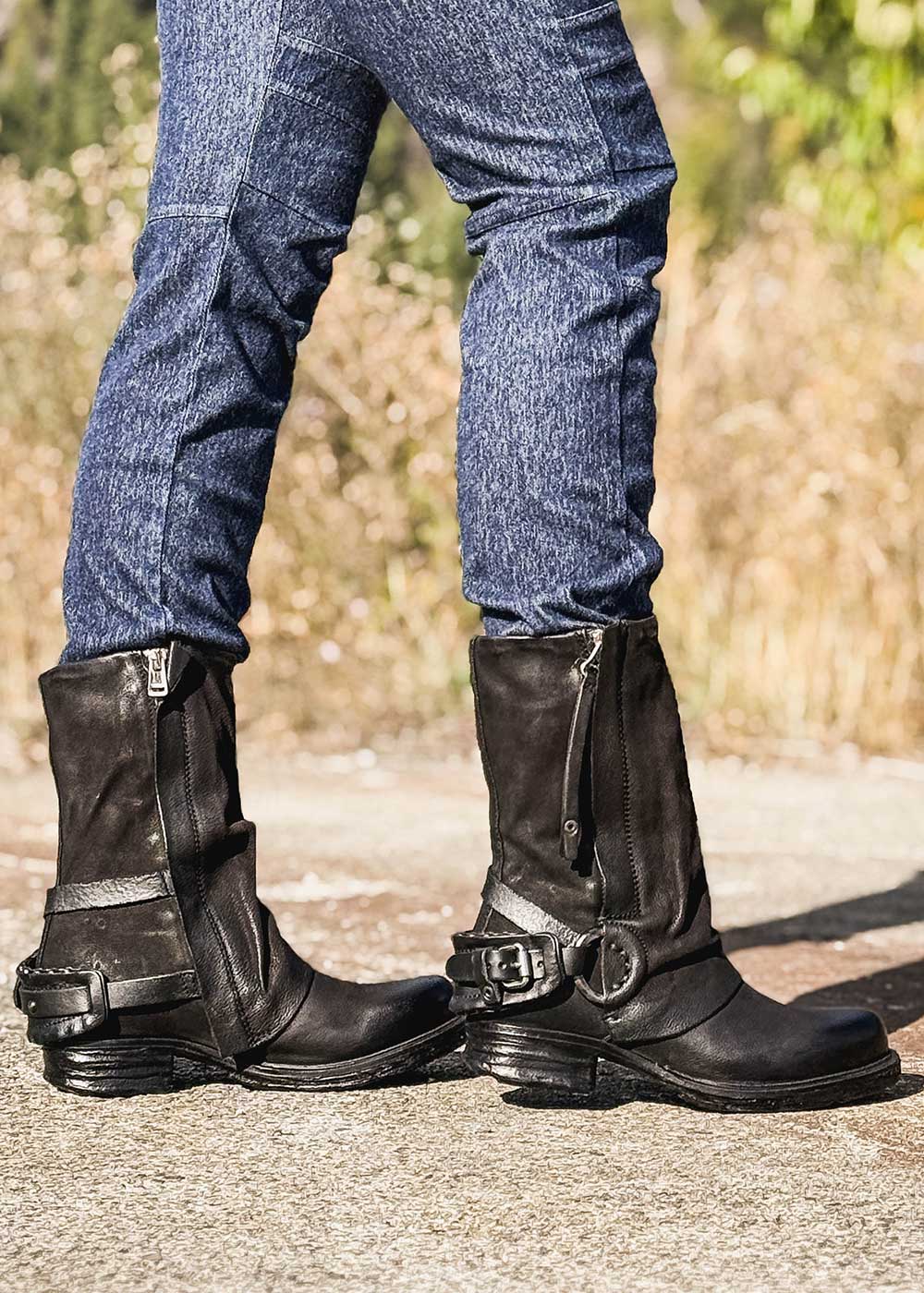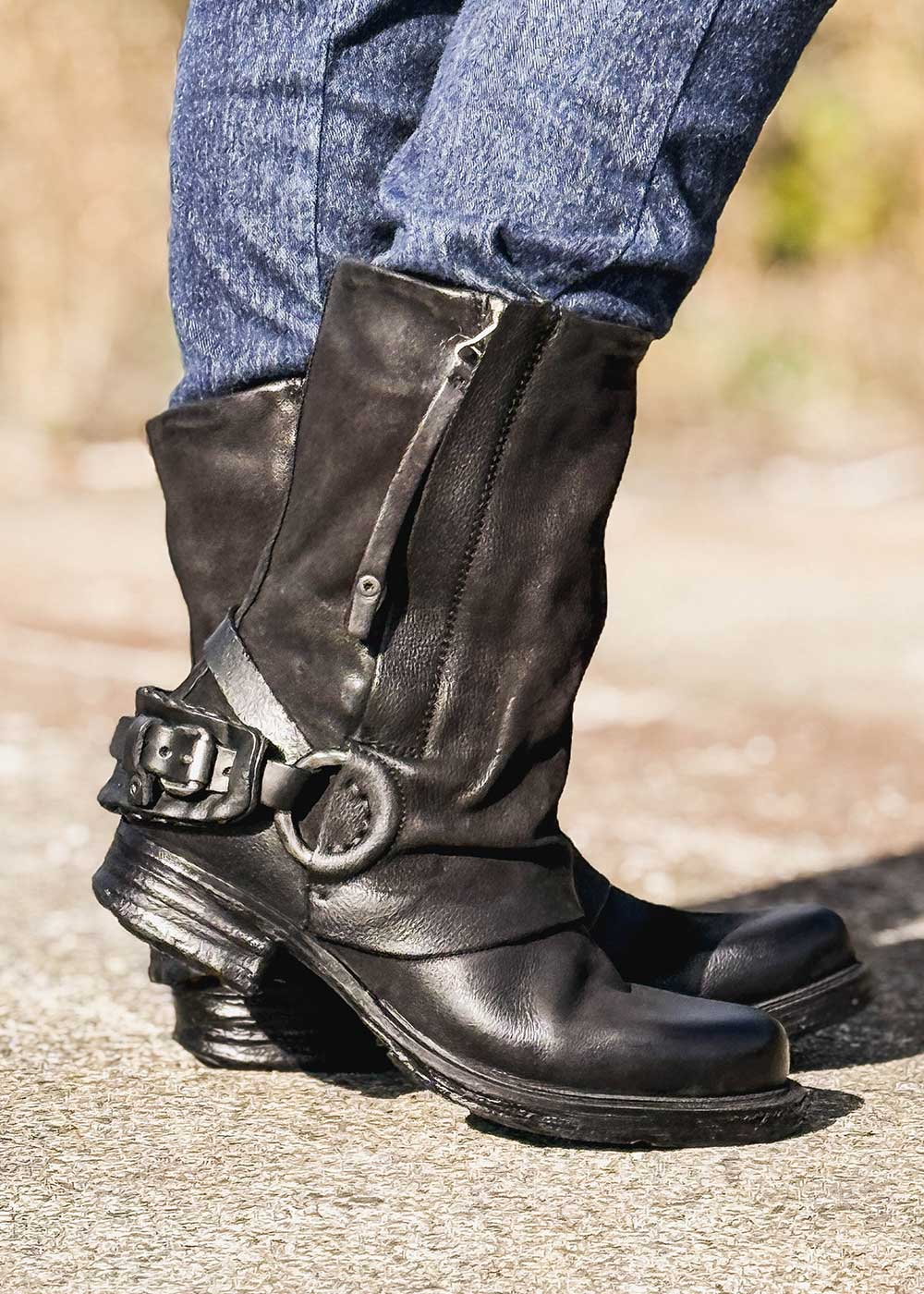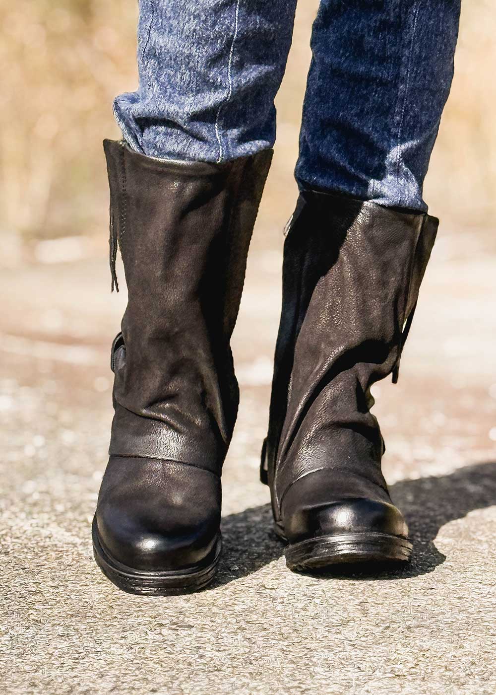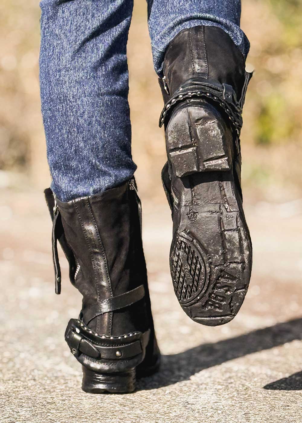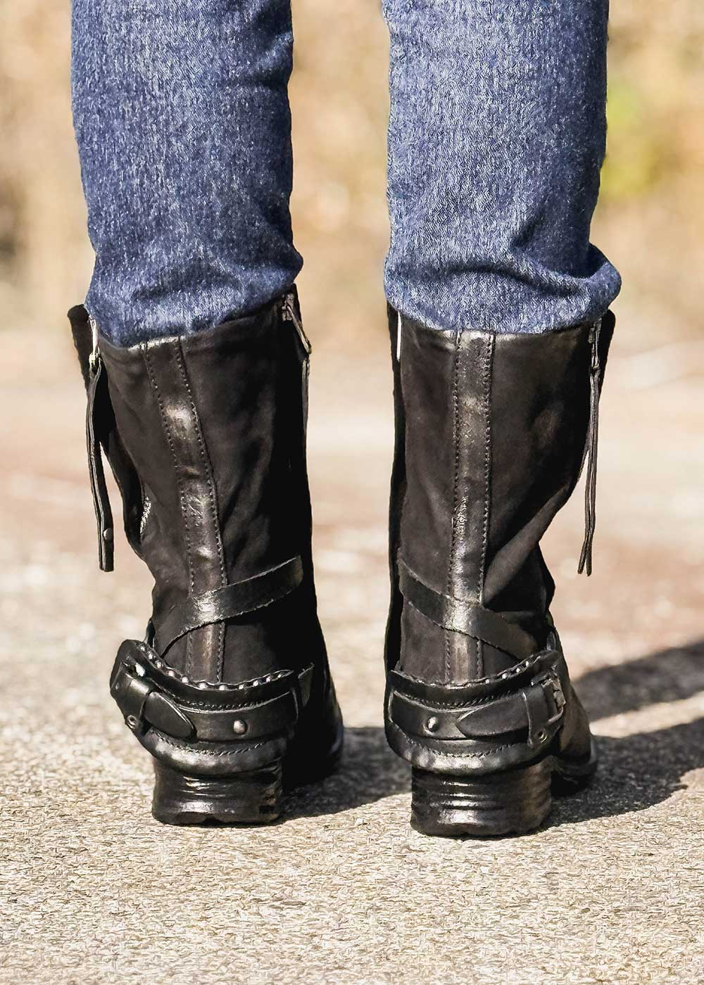 Step into your wild side with the Harlow boots — part pirate, part cowgirl, and all badass. Made from genuine black leather, these mid-length beauties feature rugged faux spur straps at the back and a half-chap inspired silhouette that feels both edgy and timeless. With their distressed finish and bold hardware details, the Harlow’s are made for those who like their style with a side of rebellion.