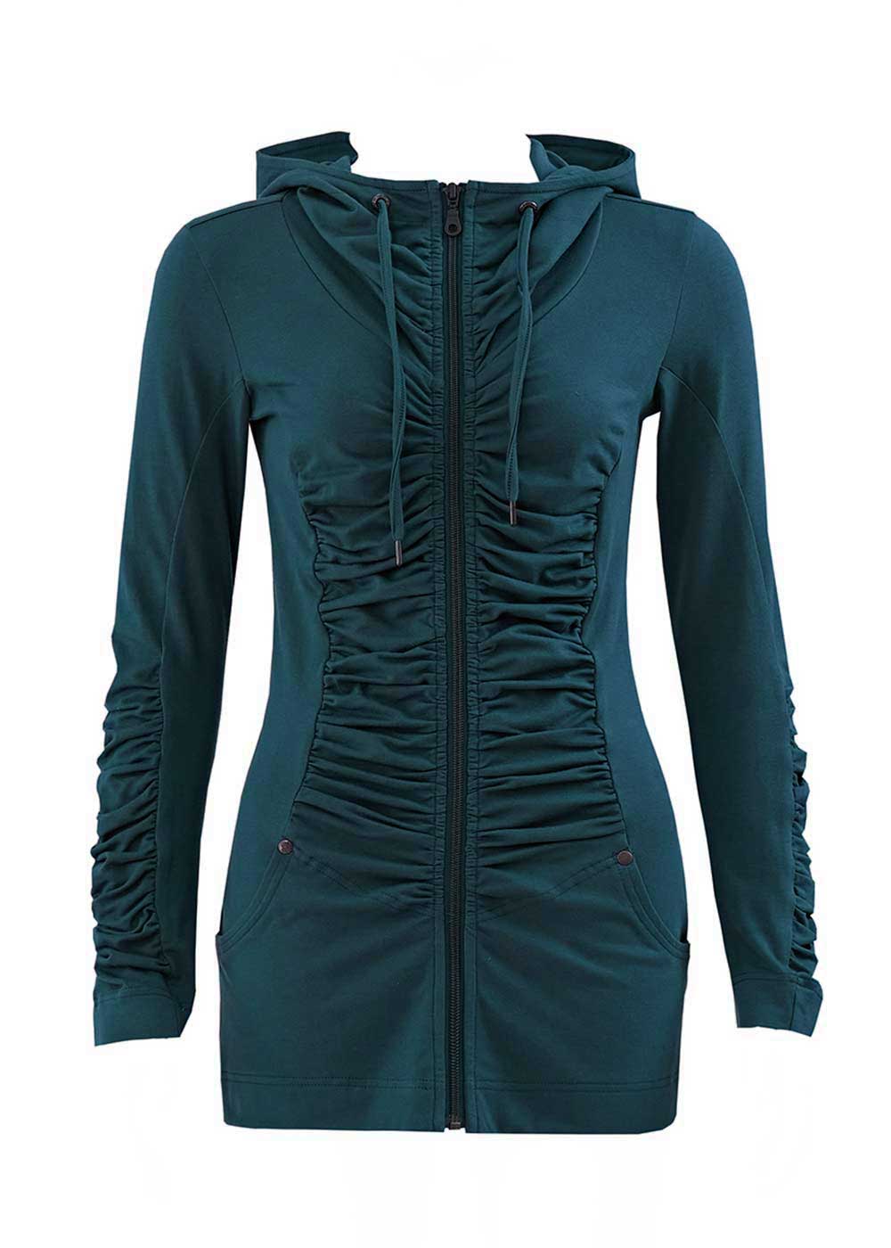 An all-time fave, this hoodie has a ruche-explosion down the front, back and sleeves. Princess lines accentuate your curves, and when we say “princess” we mean like Princess Mononoke with environmental ass-kicking powers while she rides her super-sized bug-mobiles. Two front pockets, and a fitted hood for windy rides. Our all time best-seller.